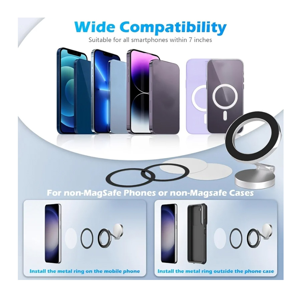 Ez a kompakt, mágneses autós telefontartó letisztult ezüst megjelenésével és masszív alumínium kialakításával ideális megoldás a biztonságos és kényelmes telefonhasználathoz vezetés közben. Az erős mágneses rögzítés stabil tartást biztosít, miközben a hajtható kialakítás maximális rugalmasságot nyújt.