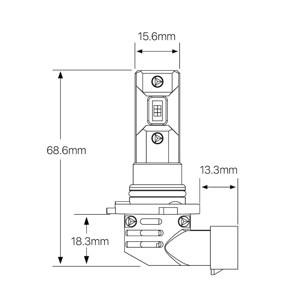 A mérete és a gyujtópont elhelyezkedése szinte miliméterre pontosan megegyezik a gyári HB3 izzóéval. Ennek köszönhetően a legtöbb lámpatestbe berakható.