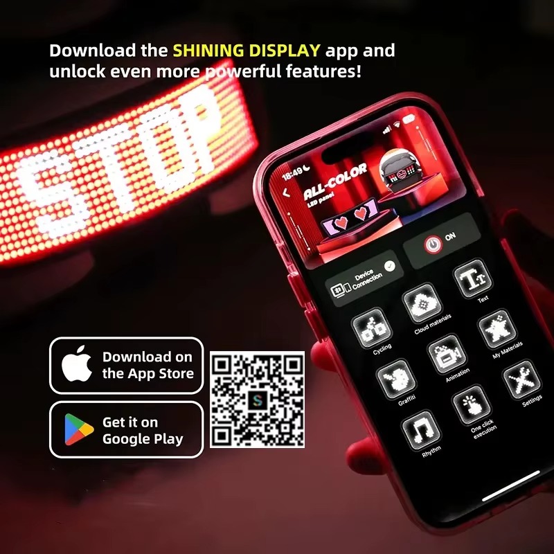 Ez a modern LED sisakkijelző több praktikus funkciót egyesít egyetlen eszközben. Használható hátsó lámpaként, irányjelzőként, sebességkijelzőként, valamint egyedi minták és üzenetek megjelenítésére is. Ez nemcsak növeli a biztonságot, hanem élvezetesebbé és személyesebbé is teszi a közlekedést.